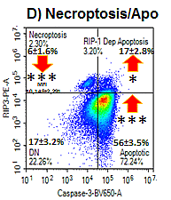 Cells during necroptosis auto-phosphorylate RIP1 which then phosphorylates and up-regulates RIP3 expression forming the necrosome. Mixed Lineage Kinase Like (MLKL) protein is then also phosphorylated which then forms pores within the cell plasma membrane resulting in cell necrosis. This up-regulation of RIP3 can be measured flow cytometrically with Caspase-3 being used to identify early and late apoptosis as well as RIP1-dependent apoptosis in both live and dead cells, see figure.